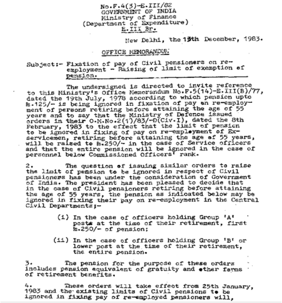 3. | Ministry of Finance OM No F.4(3)-E.III/82 dated 13 Dec 1983 | Entire pension of reemployed ex-servicemen/pensioner retired before 55 yrs of age will be ignored for pay fixation | Click here to open |
