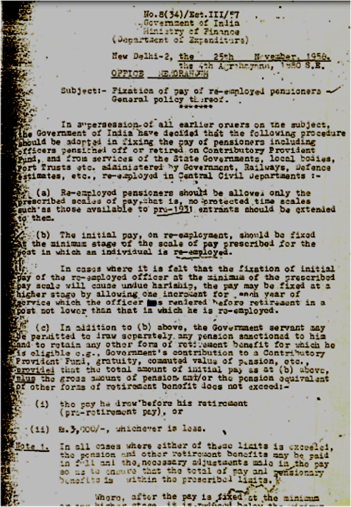 Gist of OM of 1958 regarding Pay Fixation of Reemployed Pensioners – Fixation of pay of Reemployed Exservicemen/Pensioners – with amendment vide OM of 1983.